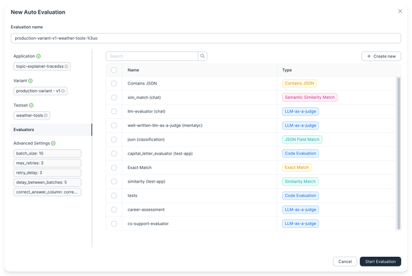 To start an evaluation, navigate to the Evaluations page and click the Start new evaluation button. A modal will appear, allowing you to setup the evaluation.